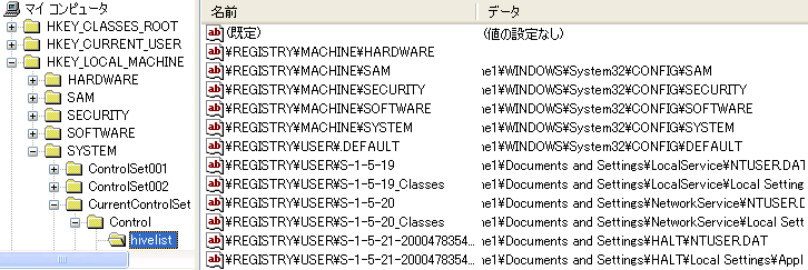 上図の右ペインは見慣れない書き方で記してあるが、ここに挙がっているファイルがあなたが現在ログオンしている WinXP の環境で使用中のレジストリハイブなのである。