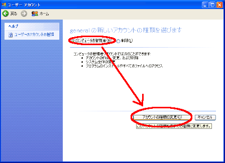 「新しいアカウントの種類」で、「コンピュータの管理者」のラジオボタンをクリックした後、「アカウントの種類の変更」を押下すれば、そのアカウントは Administrators グループに所属が移行したことになる。