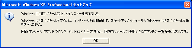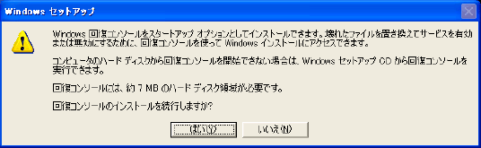 CD ドライブに WinXP のシステムディスクを入れ、スタートメニューから DOS ウインドウを実行して開き、CD ドライブ上の i386 フォルダにある winnt32.exe に /cmdcons オプションを付けて起動すると回復コンソールのインストールが始まる。CD ドライブを仮に「Q:」ドライブとすれば、