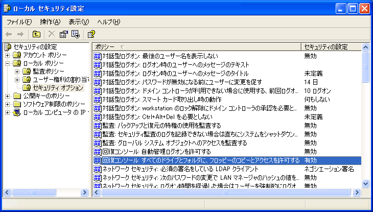 右側のペインに現れた「回復コンソール:すべてのドライブとフォルダに、フロッピーのコピーとアクセスを許可する」をダブルクリックする。