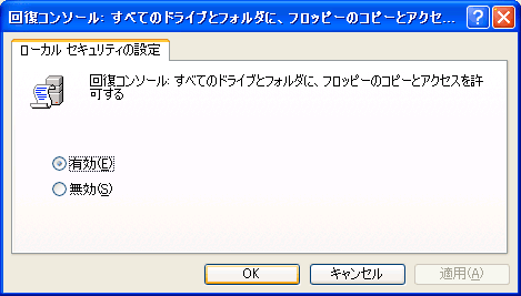 回復コンソールでのファイルアクセスに自由度を与えるために、設定を「有効」にして「OK」を押下する。