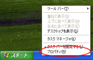 タスクバーの何もないところで右クリックし、表示されたメニューから「プロパティ」を選んでクリックする。
