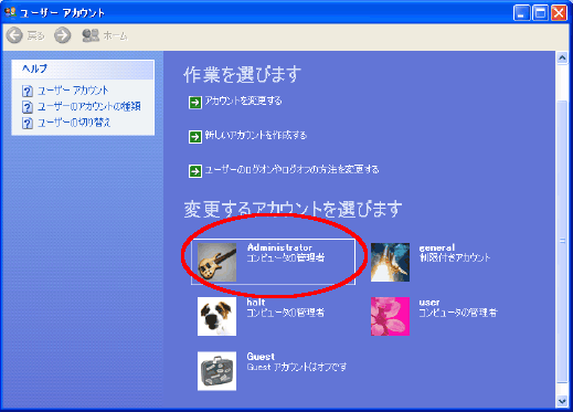 「スタート」メニューの「コントロールパネル」をクリックして開いた窓から「ユーザアカウント」を実行し、Administrator を選択する。