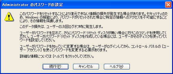 上記ウインドウで「続行」を選ぶと、パスワードの再設定を行える。