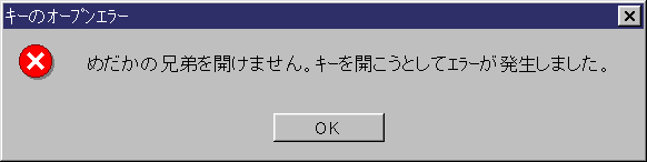 「レジストリエディタで状態を見てみると、取り込んだ日本語名のキーは存在しているのですが、マウスでクリックしてもカーソルキーで選んでもエラーが出てしまいます。選べなくては、直接の修正も削除もできず、結局1つ上の階層のレジストリキー以下を全て削除するしかなくなります。」