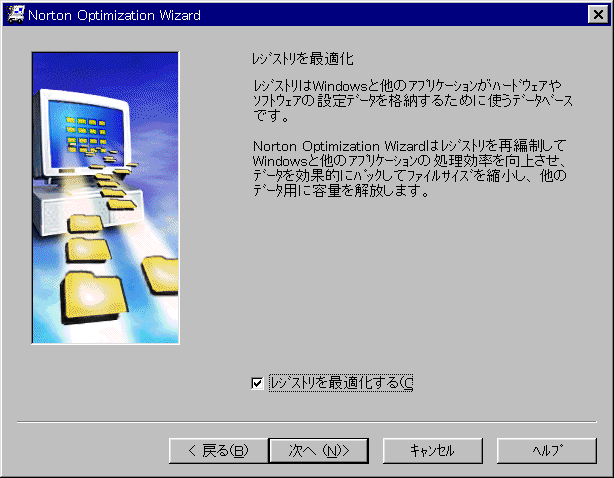 このインストールCDには、パッケージに印刷された13のツールの他、多くのユーティリティを含んでいる。うち「Norton Optimization Wizard」では、Windows環境最適化の1つとしてレジストリ圧縮を行える。ウイザードのこの画面でチェックボックスを入れるだけでよい。