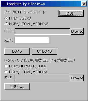 このソフトは、現在運用中のレジストリに外部のレジストリデータベースを一時的にリンク(ロード)したり、あるいは、運用中のレジストリからレジストリキーをレジストリデータベースの形で書き出すことができる。