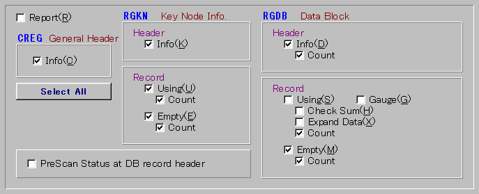□ Check Sum … レジストリキー名のチェックサムを計算し出力するならチェックを入れる.幽霊キーの確認に使用する □ Expand Data … レジストリデータを出力するならチェックを入れる.レジストリキーによっては含んでいるレジストリデータが多いため、ここにチェックが入っているとレポート作成に時間が掛かる.なお、1つのレジストリデータは一行に入るだけの内容に切り取って出力される. □ Count … レジストリキーの内部的な存在数を出力するならチェックを入れる □ Gauge … 出力する項目ごとに、各データの項目名を略称で表示(ゲージ表示)するならチェックを入れる.レジストリキーが沢山あって全てのデータを展開する際、出力開始位置だけにゲージを表示すると、レポートの下の方で出力データの意味がつかみにくくなる.逆に、小さなレジストリを解析する際には、いちいちゲージが出力されては鬱陶しい.適宜、チェックを選択する □ Empty … RGDB 群にある空きデータレコードの情報を出力するならチェックを入れる □ Count … RGDB 群にある空きデータレコードの数を出力するならチェックを入れる … Registr!p の内部的な話になるが、レポート作成前に RGDB を一度全て読み通してデータの位置を予め配列変数に格納する工程(Prescan プリスキャン)がある.その中身をダンプするならチェックを入れる. プリスキャンは単なる高速化の手法ではない.RGDB に記されているレコード数と実際に存在するレコード数が往々にして食い違うため、独自にレコードの存在を確認する必要があるのだ. □ Select All ボタン … 上記全ての項目にチェックを入れる |