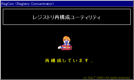 オプション画面を「OK」をクリックして閉じ、RegCon 扉画面にて「OK」をクリックすると再構成が始まる。再構成中はアニメーションが表示される。