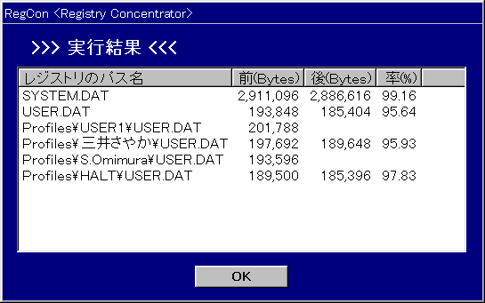 「再構成されたレジストリができました」の文字をダブルクリックすると、再構成前後のレジストリサイズ比較表を表示できる。このまま再構成を完了するかどうかの判断材料にしてもらっても構わない。