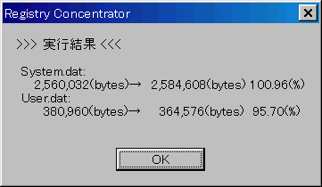 通常はレジストリを再構成すれば、無駄な領域が追い出されてファイルサイズが小さくなるのだが、再構成の際のレジストリキーの組立てかたによっては再構成後の方がファイルサイズが大きくなることもある。但し、この場合でも内部はきちんと再構成されている。
