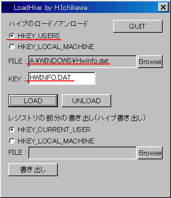 なお、レジストリファイルのロードを解除するには、LoadHive の UNLOAD ボタンを使用する。アンロード先のキー名を指定しておく必要がある。