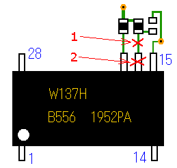 となりの15番ピンがGNDなのに、それと繋がっていない状態で「FSB=100MHz」であるから、16番ピンは、H=100MHz、L=66MHzと考えて良いだろう。そうすると、プルアップ抵抗の先で、ピンにパターンが繋がるまでに、配線を絶ってやればよいわけだ。上図位置1のパターンカットか、位置2の足上げという選択肢があるが、無難なのは足上げの方だろうか。