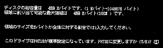 とオプション付きでFDISKを起動し、FAT32で初期化できるようにする。ちなみに489MBをFDISKで確保する場合、FAT16なら1クラスタ8KB、FAT32なら1クラスタ4KBとなる。infファイルなど小さなファイルもあるのでクラスタサイズには気を配らねばならない。